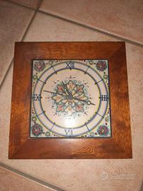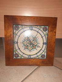 orologio in legno d'ulivo con mattonella dipinta artigianalmente, misure 22×22.
