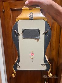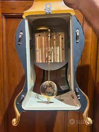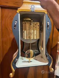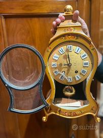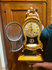 Elegante orologio da tavolo e/o parete vintage Swiss Made, dal fascino senza tempo. Splendido esemplare a carica manuale (a molla) con movimento meccanico e pendolo visibile, racchiuso in una raffinata cassa dorata con decorazioni floreali dipinte a mano. Il quadrante con numeri romani e dettagli ornamentali lo rende un vero pezzo d’arredo oltre che un oggetto da collezione. ✔ Produzione svizzera ✔ Meccanismo originale a carica manuale ✔ Pendolo funzionante ✔ Sportello frontale in vetro apribile ✔ Completo di base originale ✔ Design classico stile Neuchâtel / Palais Royal Ideale per arredare ambienti classici, studi o salotti, oppure per collezionisti di orologi d’epoca. Condizioni: buone condizioni generali (come da foto), con normali segni del tempo che ne testimoniano l’autenticità. 👉 Oggetto raro e decorativo, perfetto anche come idea regalo.