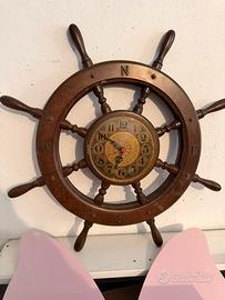 Vendo splendido orologio da parete vintage a forma di timone, un pezzo d'arredo di grande carattere, perfetto per una casa al mare, una taverna, un ufficio o direttamente da installare in barca. L'oggetto si distingue per la qualità dei materiali e del componente tecnico: Caratteristiche Principali: • Materiale: Struttura in legno massiccio lavorato con 8 razze sagomate. Il legno ha una bellissima tonalità calda e scura. • Meccanismo di Qualità: Sul retro monta un movimento al quarzo originale U.T.S. (Made in Germany). A differenza dei comuni meccanismi economici, i movimenti tedeschi UTS sono celebri per la loro precisione e durabilità nel tempo. • Quadrante Artistico: Fondo dorato con decorazioni finemente lavorate, numeri arabi eleganti e lancetta dei secondi rossa per una lettura immediata. • Dettagli: Sul bordo in legno sono incisi i punti cardinali (N, S, E, W) che completano lo stile nautico. • Dimensioni: Ideale come punto focale su una parete, non passa inosservato. Stato dell'oggetto: L'orologio è in ottime condizioni estetiche, con quella leggera patina vintage che ne esalta il fascino d'epoca. È già dotato di gancio posteriore rinforzato, pronto per essere appeso.