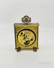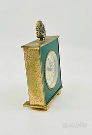 Orologio da tavolo vintage Titanus, pezzo da collezione. Cassa rettangolare con pannello frontale verde bosco e dettagli in metallo dorato. Funzionamento meccanico, utilizzato all'epoca per il viaggio o da scrivania. Quadrante con le ore in numeri romani, decoro floreale al centro, "2 Jewels" scritto davanti, indica il numero di rubini nel meccanismo, il suo stile richiama il periodo Art Déco o la metà del XX secolo, con una maniglia ornamentale parte superiore e piedini di supporto alla base. Evidenzio metallo ossidato e graffiato alla base, funzionamento da verificare. Larghezza cm 7 Altezza cm 8 Profondità cm 3