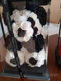 Vendo orsetti con scatola di colore rosso e bianco e nero fatti di roselline.