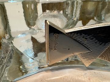 L'oggetto è composto da un blocco massiccio di cristallo lavorato a ghiaccio, dalla texture irregolare che crea straordinari giochi di luce. Sul fronte è applicata una composizione geometrica in Argento 925 massiccio, rifinita con diverse texture (liscia, martellata e zigrinata) che conferiscono profondità scultorea al pezzo.