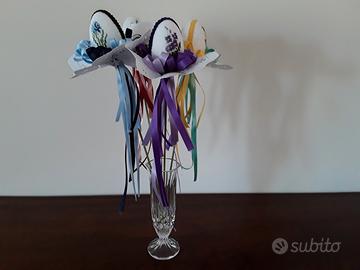 Quattro ovetti lavorati completamente a mano ( crocette ) fissati su bastoncino di legno colorato verde. Sono arricchiti da nastri in raso e da centrini di carta stampata e ricamata.