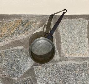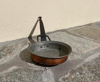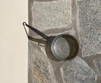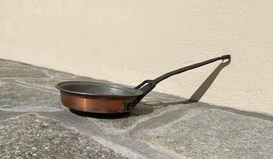 Antica padella in rame stagnato, con lungo manico in ferro battuto (lunghezza 22,5 cm) e diametro di 18 cm
