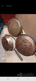 tre padelle in rame battuto e stagnate. antiche da camino. ideale anche per arredamento. vendo insieme.