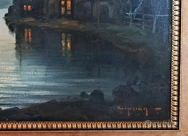Titolo: Paesaggio notturno con barca e casa sul lago, firmato Cipriani