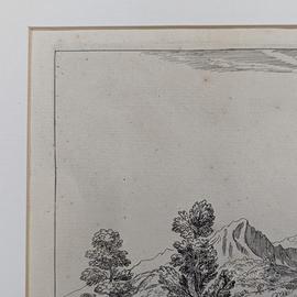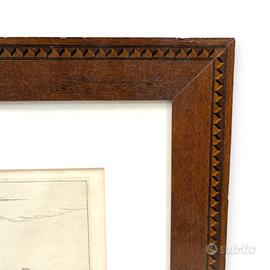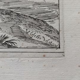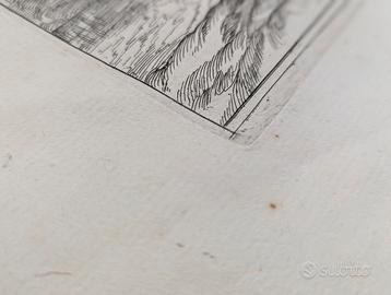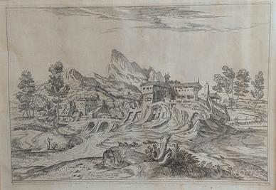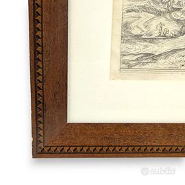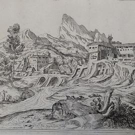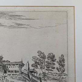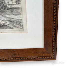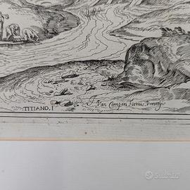 Incisione originale seicentesca su soggetto di Tiziano, opera di Valentin Lefebre e stampata a Venezia da Jan Van Campen (Titiano I – V. Lefebre del. et scul. – J. Van Campen formis Venetys). Grande paesaggio montano con borgo fortificato, ponte a piu' arcate e figure al fiume, ricchissimo di dettagli e di gusto pienamente veneziano. Tiratura d’epoca all’acquaforte/bulino su bella carta vergata, con margini integri e visibile impronta del rame; foglio ca. 43×55,5 cm, lastra 26,2×38,7 cm, montata in cornice in legno intarsiato 52×65 cm con passe-partout neutro. Condizioni complessivamente buone per l’eta': leggera uniforme ingiallitura, qualche fioritura, piccoli fori di antica rilegatura e minime pieghe ai margini non invasivi. Pronta da appendere, ideale per collezionisti di grafica antica o per arredare ambienti classici di rappresentanza.