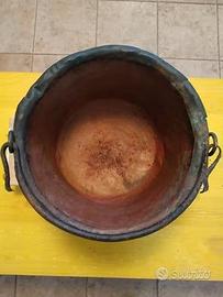 Paiolo in rame antico, fine anni '800 con manico in ferro battuto. Buone condizioni di conservazione. Misure della pentola, diametro cm 26 e altezza cm 17.
