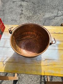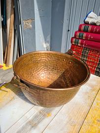 Autentico paiolo antico in rame martellato a mano, con manico ad arco apribile in ferro battuto. Pezzo di artigianato italiano tradizionale di metà 900. Corpo in rame martellato a mano. Solo uso decorativo — l'interno non è stagnato, non adatto alla cottura. Prezzo trattabile, contattami per altre informazioni.