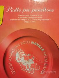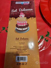 Paletta E Coltello Per Dolce. Lame in acciaio inox, manici in plastica. Lavabili in lavastoviglie. Compreso nel prezzo piatto per panettone nello stesso colore. Piatto in acciaio, diametro 30 cm. Tutto nuovo in confezioni originali.