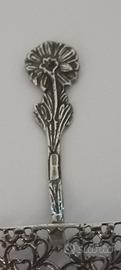 Paletta da torta in miniatura, finemente realizzata in argento 800 con lavorazione traforata a motivi floreali e impugnatura decorata da un fiore in rilievo. Oggetto da collezione o per bomboniera. Misura cm11,5x5. Peso gr.14. Punzoni presenti.