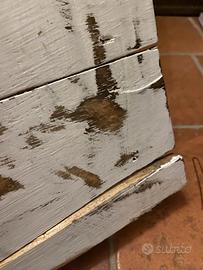 Il pallet è stato fatto per essere appeso: in foto potete vedere che un gancino è mancante. Inoltre sono presenti delle ammaccature nel legno nell'angolo in basso a destra ma facilmente sistemabili.