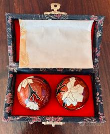 Coppia di palline cinesi antistress con relativo cofanetto originale. Muovendole le palline enettono un suono rilassante. Un piacevole regalo per ogni occasione.