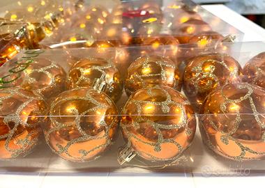 Set di palline decorative per l'albero di Natale. - Design con motivi glitterati e disegni a spirale. - Colore arancione intenso con dettagli dorati.