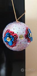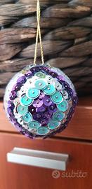 Palline di Natale artigianali realizzate a mano con cura e attenzione ai dettagli. Ogni pallina è decorata con paillettes colorate applicate una a una con spilli su base in polistirolo, creando fantasie geometriche luminose e scintillanti. Le decorazioni presentano diverse combinazioni cromatiche: tonalità blu e turchese, viola e fucsia, rosa e blu, rosso e blu.