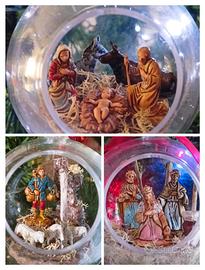 Si tratta di tre palline natalizie trasparenti in plexiglass da 6,5 cm trasformate in piccoli diorami che raffigurano le scene principali del presepe.