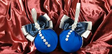 3 palline di natale in tessuto blu elettrico con decori di strass e fiocchi argento. Realizzate interamente a mano.