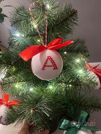 Ogni pallina è ricamata a punto croce su tessuto bianco, con colori natalizi (rosso, verde o bordeaux) e decorata con un fiocco coordinato.