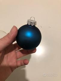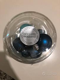 Vendo una confezione da 25 palline in vetro. Le palline sono nuove e non sono mai state titate fuori dalla confezione. I colori variano dal blu all’azzurro ( vedi foto). Le palline hanno un diametro di circa 6 cm.