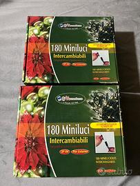 Una confezione di 180 mini luci perfettamente funzionanti, più un'altra scatola sempre da 180 mini luci da utilizzare come ricambio in quanto manca la presa di corrente. (Tutte luce calda bianca).