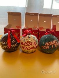 Nr 6 palline Natale segnaposto (duametro cm 8) Brandani della collezione “Tormentoni di Natale”, di queste nr 2 “ Merry Christmas” e “Jingle Bells” sono dotate di relativa suoneria, funziobsnti e con pile inserite. Materiale polistirolo verniciato. Tutte con scatola originale e all’interno cartellino segnaposto (uno mancante).
