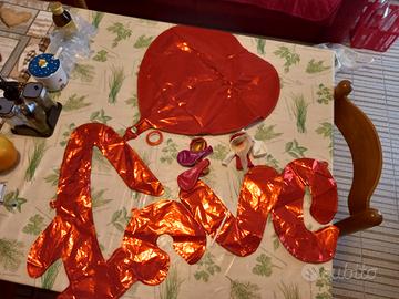 Palloncino gonfiabile con cannuccia, uno a forma di cuore, uno scritta 'love'.