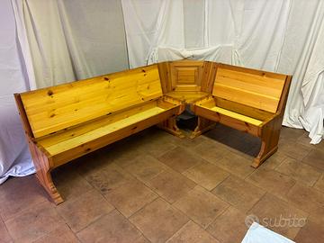 Panca angolare in pino massello 200 x 135 x h. 81 cm con sedili apribili e contenitori. Completa di tavolo in pino massello 150x80x h. 72 cm e 2 sedie
