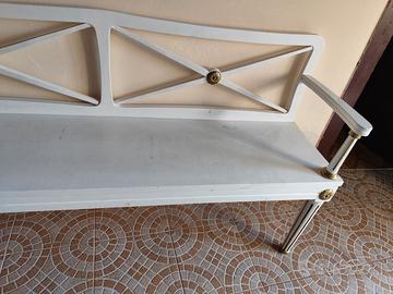 Panca vintage anni ’50 in legno laccato bianco con dettagli in ottone. Elegante e solida, ideale per ingresso o corridoio. Buone condizioni, normali segni del tempo.
