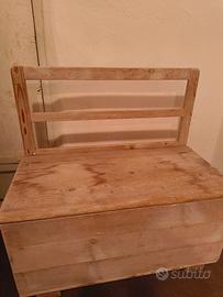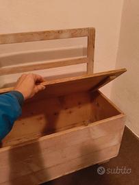 Panca contenitore com schienale realizzata in legno massiccio da artigiano locale molti anni fa. buono stato, ancora utilizzabile anche per sedersi - evidenti segni del tempo. Dimensioni: larghezza 77cm, profondità 40cm, altezza totale 79cm, altezza seduta 49cm. Solo consegna a mano