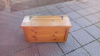 vendo panca contenitore in legno massello, piccola e compatta ma molto robusta e capiente, qualche segno sulla seduta dovuto all'utilizzo, misure 79x33x47h