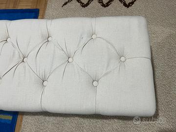 Per mancanza di spazio metto in vendita questa panca contenitore. La stoffa é in buono stato. Ha soltanto un piedino rotto ma al suo interno la filettatura é integra. Puó essere utilizzato per riporre cuscini o coperte sia in camera da letto che in soggiorno.