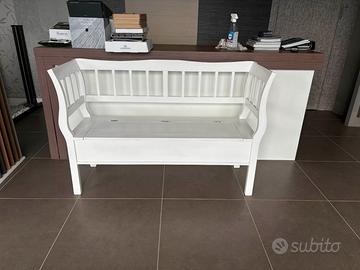 Panca in legno bianca con seduta contenitore ,utilizzata per esposizione. Larga 1.40 profonda 45. Altezza da terra 46 .
