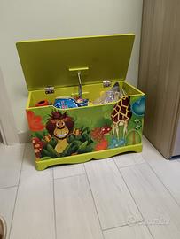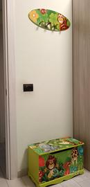 Vendesi panca riponi giocattoli e appendiabiti coordinato per cameretta bambino, in buono stato a 30€ in blocco.