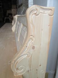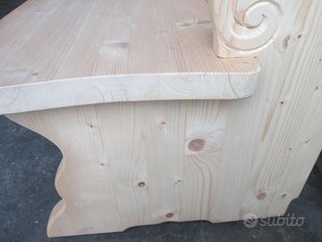 Panca in abete rosso massello lamellare, tutta un pezzo, misure lunghezza max 4,38 m, altezza 88 cm, profondità max 65 cm, seduta prof. 45 cm, spessore 4 cm . Con le due fiancate iniziali intarsiate. Tutto da verniciare . Disponibili diverse unità tutte uguali.