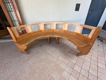 Panca in legno produzione artigianale Lacedelli Cortina semicircolare con struttura ad angolo misure cm 260 x cm 215 - h cm 85 - 8 sedili - 1 vano a giorno larghezza cm 70. La panca è già smontata e può essere facilmente trasportata. E’ possibile ridimensionare la panca eliminando una seduta ma modificando il top di copertura. possibilità di organizzare anche trasporto a prezzo da concordarsi