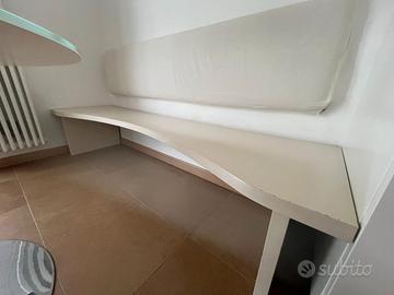panca in legno con forma stondata. alcuni punti sono da ritoccare con pennellino bianco avorio