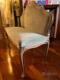Questa panca o divanetto in stile Luigi XV, caratterizzata da linee curve e sinuose tipiche del periodo Rococò è un pezzo Vintage di metà ‘900. Presenta uno schienale sagomato con intagli centrali in legno e seduta imbottita. La struttura è realizzata in legno di noce mentre la seduta e lo schienale sono imbottiti in velluto verde tipico del periodo. Il pezzo è in buone condizioni e le sue misure sono L. 113 - P. 44 - H. 100. Possibilità di visionarlo. Ritiro e trasporto a carico dell’acquirente. Pagamento alla consegna. ZC