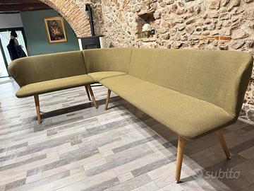 Vendo divano angolare originale Voglauer, in stile elegante e retrò, perfetto per ambienti rustici, moderni o industrial. Il divano ha una linea pulita e sofisticata, con schienale alto e seduta comoda. Le gambe in legno conferiscono un tocco naturale ed elegante. Ideale per una cucina, un soggiorno o una taverna di design.