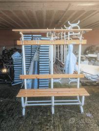 Vendo panca spogliatoio con struttura in metallo e doghe in legno, completa di barra superiore e ganci appendiabiti.