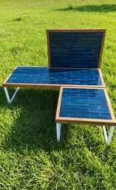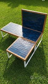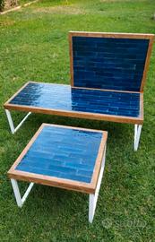 Vendo panca più tavolino componibili da disporre in maniera diversa in base alle proprie esigenze o situazione,realizzata con mattoncini in gres porcellanato blu scuro bordata in legno impregnato noce scuro, realizzato artigianale nuovo mai usato dimensioni tavolino 70×70cm,panca 70×160cm altezza schienale 110cm