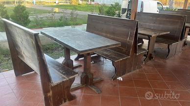 Vendo serie di panche singole e doppie complete di tavoli grandi e quadrati compreso di sgabelli tutto in buone condizioni, idelai per esterno o anche interni rustici.