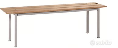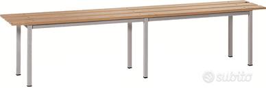 Panche per spogliatoi-palestre in struttura d'acciaio con rivestimento superficiale. Seduta realizzata con doghe in legno verniciate al naturale.