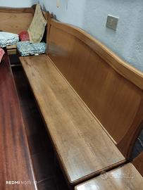 Sono tre panche in legno chiaro . Abbinabili a tavola frattina. Ogni panca lineare 120 l' una. La panca ad angolo 180. Se vendute insieme totale 400
