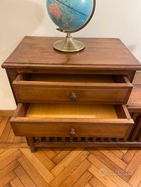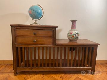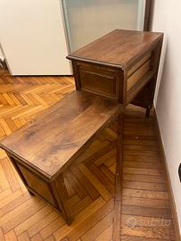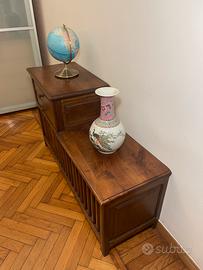 Panchetta artigianale in legno massello, originale degli anni ’70, caratterizzata da un design particolare con doppio livello e frontale a doghe verticali.