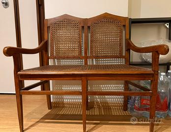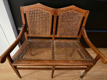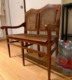 Panchetta 2 posti legno periodo coloniale, braccioli curvi. Seconda metà del 900 con seduta in paglia di Vienna (cannage) in ottimo stato Dimensioni ridotte Lunghezza circa 80 cm profondità della seduta circa 35cm Altezza della seduta da terra circa 40 cm