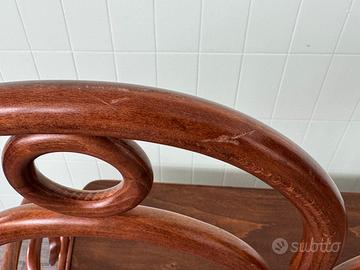 Struttura: Realizzata in legno curvato presenta uno schienale con tre ampi ovali decorati da anelli circolari superiori e braccioli a voluta.
