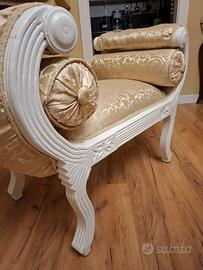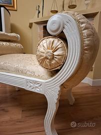 pacchetta chaise longue in stile barocco con struttura in legno bianco e rivestimento in tessuto damascato beige e oro.