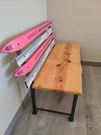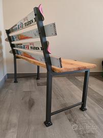Panchina realizzata a mano con telaio in ferro, seduta in legno e schienale con vecchi sci d'epoca..ottima come arredamento da montagna.
