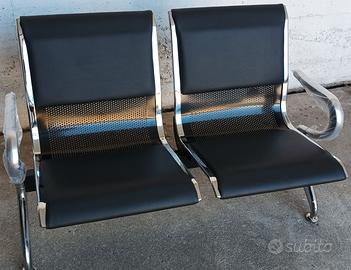 Panchina per sale d'attesa 2 posti in acciaio, con braccioli e seduta in similpelle Colore:Nero/Nero. Dimensioni :Profondità cm.63 - Lunghezza cm. 124 - Altezza cm. 80