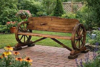 Bellissima panchina in legno massello con ruote decorative stile carro, ideale per giardino, portico o taverna. Struttura solida e robusta, lavorazione artigianale con finitura rustica che valorizza le venature del legno.